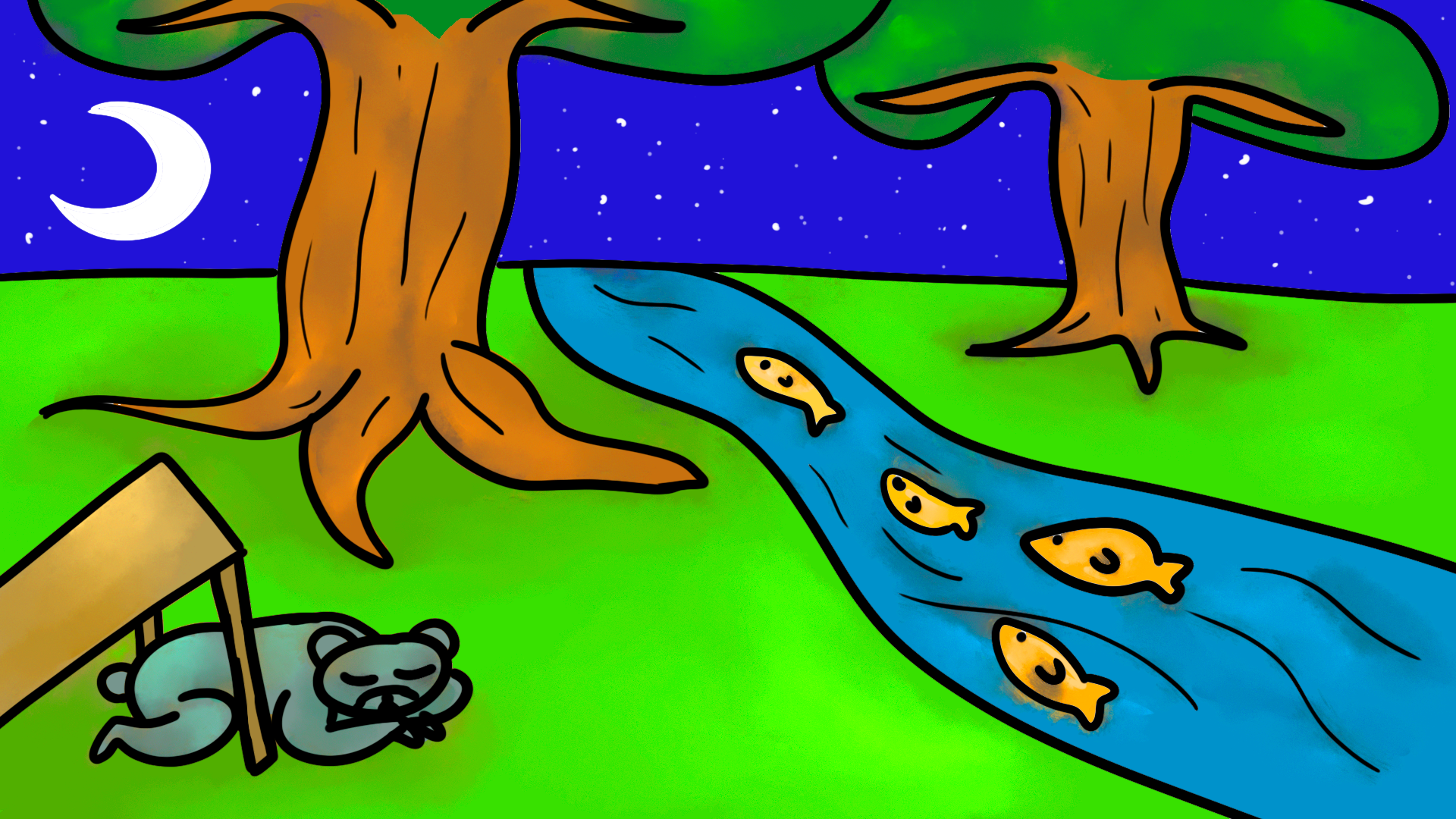 Le lendemain matin, Backou part tôt et s’enfonce dans la vaste forêt. Après plusieurs heures de marche, il y trouve une belle rivière grouillant de poissons. Bientôt, la nuit va tomber, et sans lune, tout est obscur.