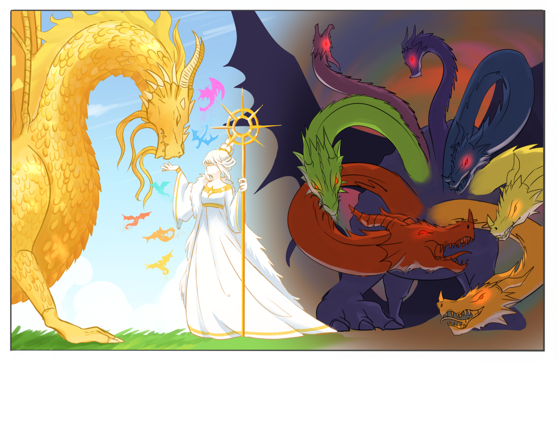 Mais dans son royaume de lumière, vit un énorme dragon, à 7 têtes ; il veut la dévorer et tous ses enfants qui veulent la rejoindre dans son royaume.