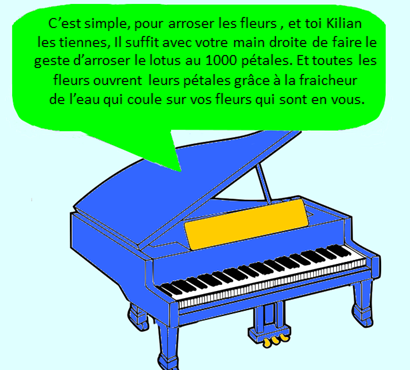 " Oui, vos fleurs rouges, jaunes, vertes, blanches, bleues, roses... elles s'ouvrent en vous, leur coeur s'ouvre parce que maintenant vous savez qu'elles existent, et alors elles peuvent fleurir complètement, si vous les arrosez bien. " dit Piano enchanté