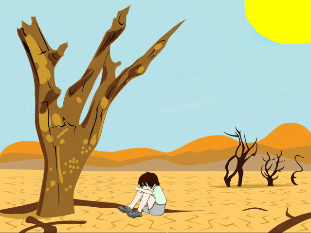 Cela fait maintenant quatre jours et quatre nuits que Roshu avance vers le nord. Les étoiles le guident et chaque soir, quand le soleil se couche, il repart avec un peu moins de force que la veille. Le manque de nourriture et d'eau l'affaiblisse.