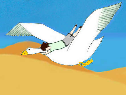 Roshu s'agrippe sur une oie qui aussitôt s'envole avec son groupe pour rejoindre leur grotte. Mais le soleil est ardent, il cogne sur l'enfant. Heureusement, le vol de l'oie apporte de la fraîcheur, et Roshu arrive sain et sauf dans la demeure des oies.