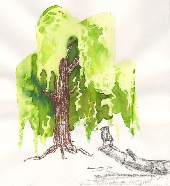 " Alors que nous, les arbres, nous sommes plantés avec nos racines profondes dans la terre. On ne peut pas se déplacer comme vous les oiseaux. " continue le saule pleureur en reniflant.