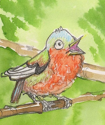 " Je me suis mis en route, bien avant le levé du jour. Soudain, le vent s'est mis à souffler si fort, que j'ai dû aller plus haut. Je ne m'étais pas servi de mes ailes depuis longtemps, mais je suis monté très vite et bientôt, je me suis trouvé dans le ciel tout bleu. Et chose étrange, j'y ai vu un singe, dans les nuages.