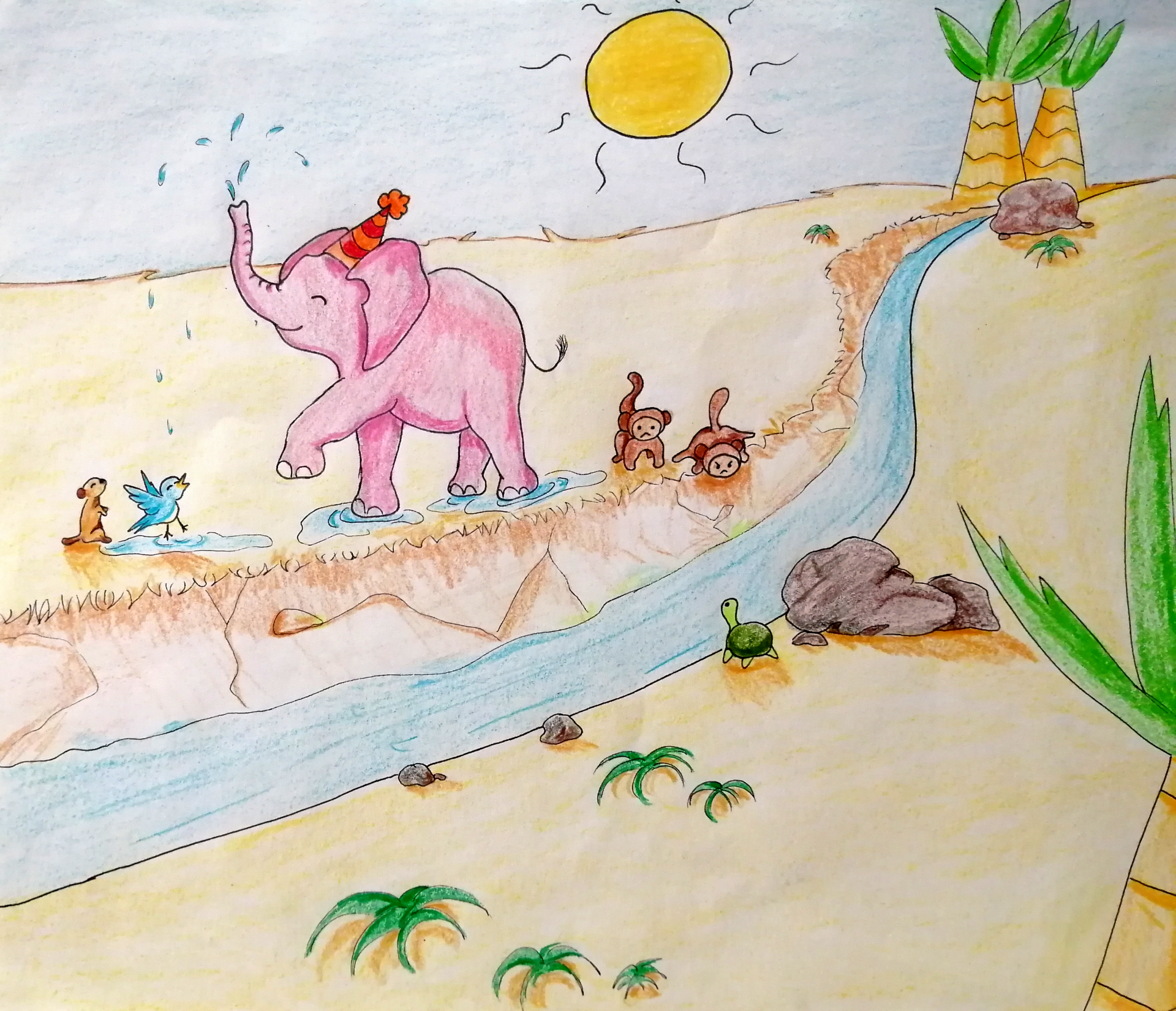 Ils sont partis fâchés, dit une tortue, près d'un rocher au bord de l'eau. As-tu vu qu'il n'y a presque plus d'eau dans la rivière? Son eau est si claire, si transparente. Qu'as-tu fait, jeune éléphant ?