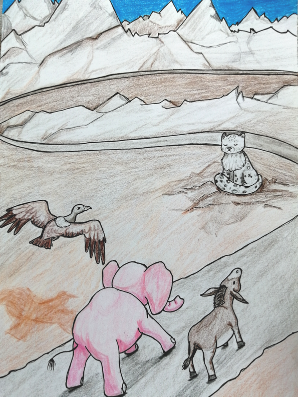 - Dans la montagne, plus on monte, plus il fait froid. Il faut se protéger du froid, du vent, de la neige, du verglas, et du soleil aussi. Et si nous avons de la chance, nous pourrons voir la panthère des neiges. Dit l'aîné des ânes.
