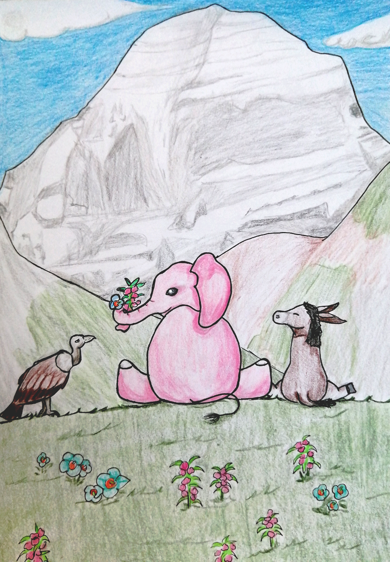 Le Vautour plane toujours haut dans les airs. Il protège Nesha et son compagnon. La montagne est si belle aujourd'hui. Il descend et s'approche de Nesha et l'âne.