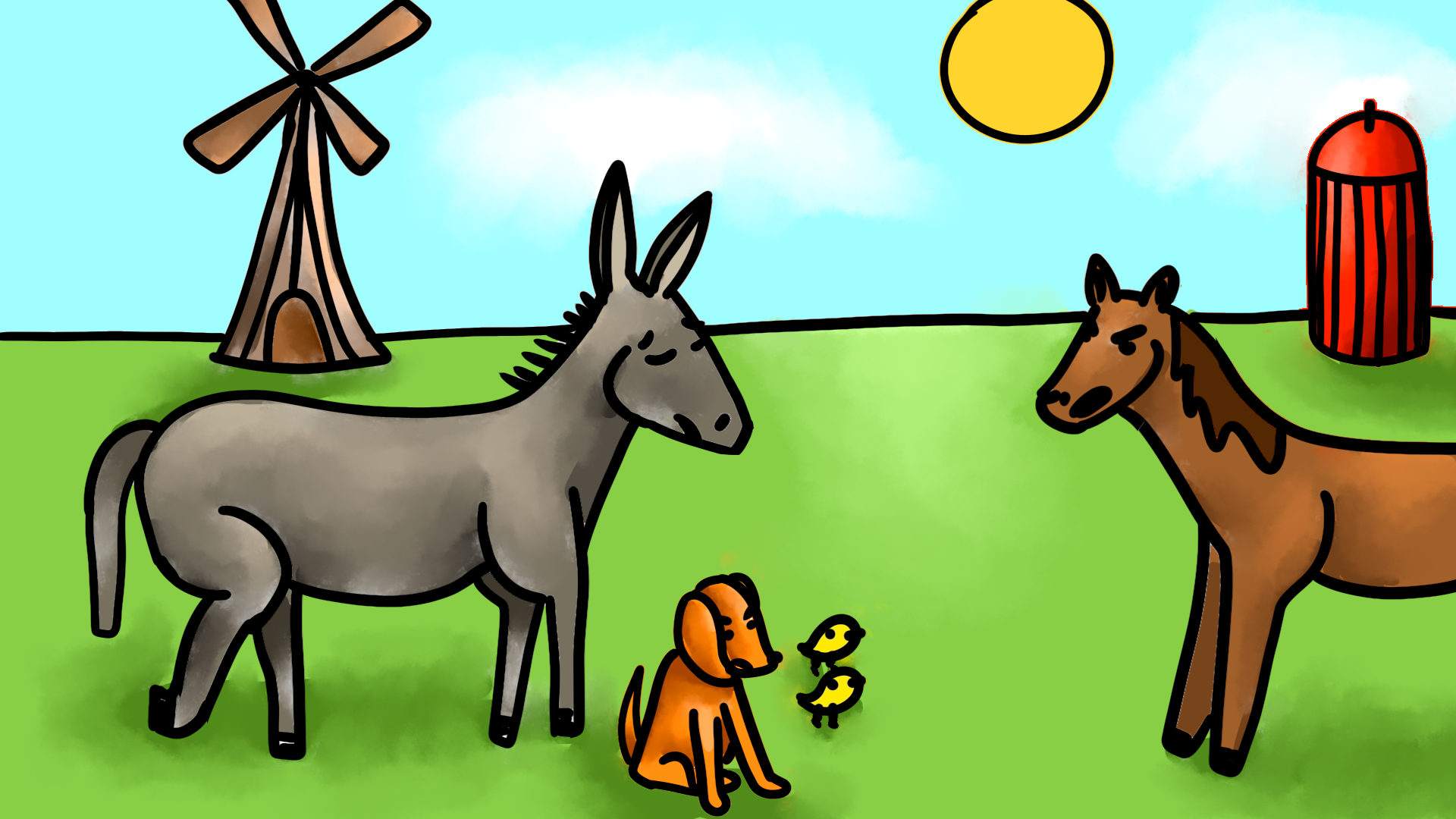 Mais les parents du poulain et des veaux, des pourceaux eux aussi, regardent les nouveaux venus d'un oeil bizarre. Des ânes maigrichons, un ânon femelle boiteux, qu'est-ce que cette famille vient faire chez nous !
