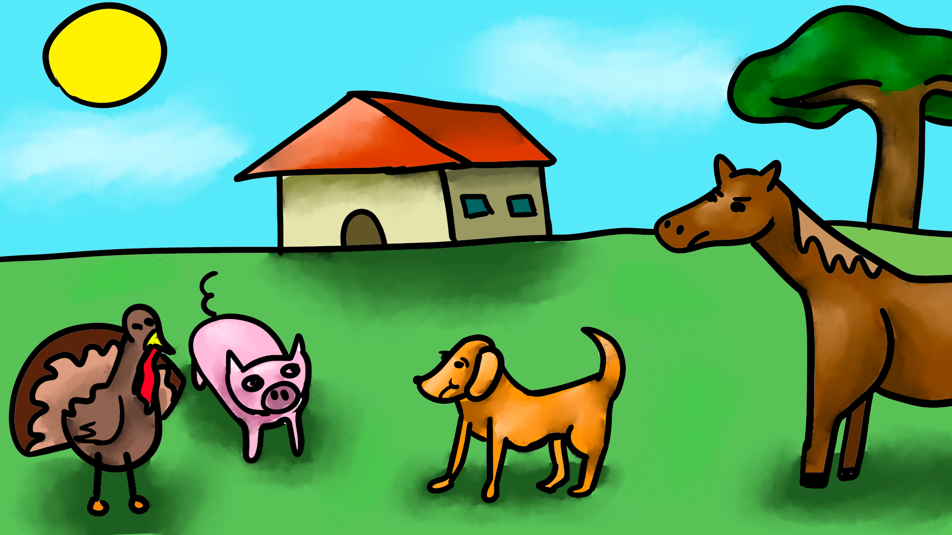 Là, les dindons se taisent. Ils sont tristes. Pourquoi ce cheval est-il si méchant ?
